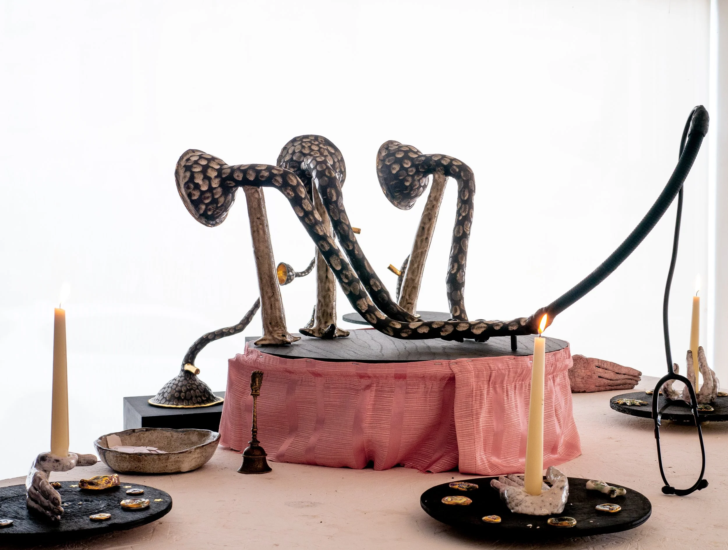 The title of the exhibition is taken from an observation made during the artists’ first visit to the tump that felt significant as a triad of interconnected symbols. Upon entering the tump, the artists were met with a sleeping bat, a creature that in many cultures is seen as a messenger from the spirit world for its ability to sense what it can’t see. In shamanism it is symbolic of death and life, endings and beginnings. The moon is widely recognised as a symbol of femininity and the embodiment of life cycles. It is intrinsically and mysteriously connected to the female reproductive system and there is even anecdotal evidence to suggest that more births occur during a full moon than other phases of the lunar cycle. In mythological lore, long barrows hold a special significance as gateways to the domain of the goddess, their entrances are interpreted as symbolic representations of the goddess's vagina, with the interior likened to her womb.